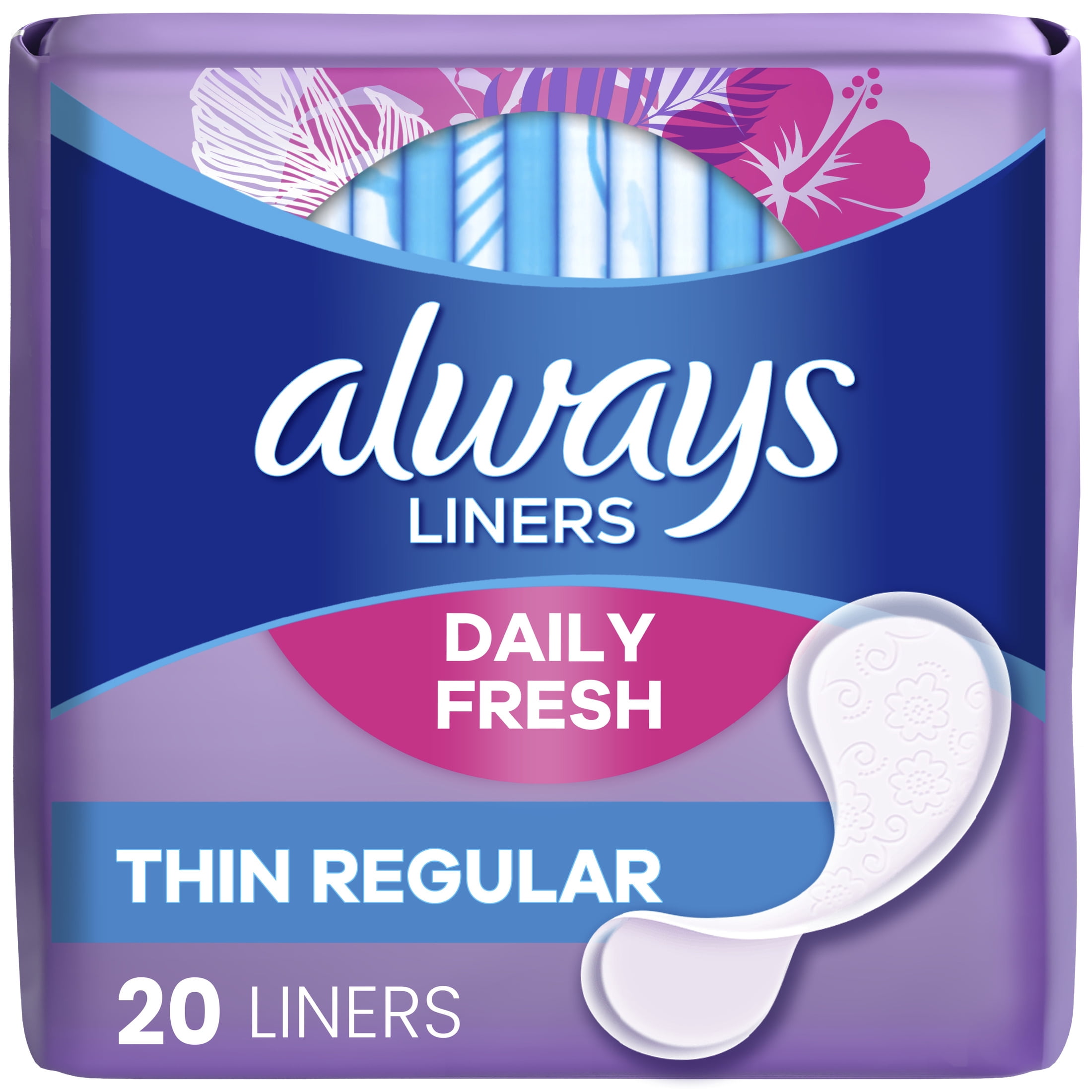 You want to feel fresh all day no matter what you do? Discover Always Thin No Feel Protection Daily Liners Regular for discreet protection against daily discharge and odors. These pantiliners are made to be thin and absorbent for everyday freshness. Plus, Always thin daily liners feature a special Edge-2-Edge™ adhesive that holds better than traditional adhesives. That means once the liner goes on, you can trust that will stay in place no matter what activities you take part in. Errands, exercise, sports and other physical activities won't stand a chance against this superior adhesive option. There's no reason to worry about what your day will entail because these Always panty liners won't budge. For comfortable protection on the go, they are individually wrapped, so you can take them anywhere. The Always Liners Fit sizing chart shows a range of liners for different shapes and needs for you to find your best fit. Get daily protection against discharge and odors that is so discreet you won’t even know it’s there. Created to be thin and discrete, Always pantiliners are comfortable and feel like fresh underwear so they can be worn at all times. Ideal for a fresh feeling every day of the month, try Always panty liners. These Always liners are designed to offer effective, safe and comfortable protection no matter where your day takes you.