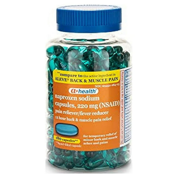 Our A+ Health Naproxen Sodium back & Muscle pain capsules are designed to reduce fever symptoms and provide 12-hour relief from minor pains due to headaches, toothaches, backaches, menstrual cramps, the common cold, arthritis, muscle aches and soreness. Pain is a signal from your body that something needs attention and can be helpful in diagnosing a physical condition. When that pain impacts daily life, treatment with an over-the-counter anti-inflammatory may be recommended. Naproxen Sodium is an NSAID (nonsteroidal anti-inflammatory drug) that is designed to reduce fever symptoms quickly and alleviate aches, pain and inflammation. Proudly made in the USA using ingredients originating from various countries, A+ Health Naproxen Sodium back & Muscle pain capsules contain the active ingredient Naproxen 220mg, which compares to the active ingredient in Aleve back & Muscle pain. The Naproxen is in liquid form and contained inside a capsule, providing fast-acting relief in an easy-to-swallow tablet. Whether you have minor arthritis pain or other aches or pains, you can find relief with A+ Health Naproxen Sodium back & Muscle pain. Contains 180 capsules.