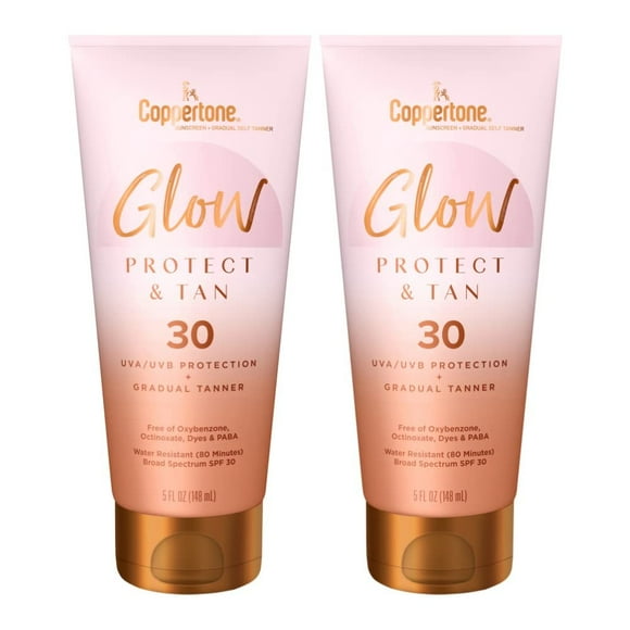 Build a sun-kissed glow while protecting your skin from the sun with Coppertone Glow Protect and Tan Sunscreen Lotion + Gradual Self Tanner. This multi-purpose Coppertone sunscreen offers proven UVA/UVB protection and gradual tanner for natural-looking color. The Broad Spectrum sunscreen is lightweight, moisturizing and water resistant (80 minutes). This body lotion with sunscreen is also free from oxybenzone, octinoxate, dyes and PABA. Each sunscreen Coppertone creates follows a tradition of trusted, quality sun protection products. Coppertone has been providing continuous innovation for more than 75 years, and is voted the most trusted sunscreen brand.* Apply Coppertone Glow Protect and Tan Sunscreen + Gradual Self Tanner whether you're relaxing during vacation or hanging out in your own backyard. Use and reapply Coppertone sunscreen as directed. *Voted Most Trusted Sunscreen brand by American shoppers based on the 2022 BrandSpark American Trust Study. * One 5 fluid ounce tube of Coppertone Glow Protect and Tan SPF 45 Sunscreen Lotion + Gradual Self Tanner * Coppertone Glow Protect and Tan SPF 45 Sunscreen offers proven UVA/UVB protection and gradual self tanner for a sun-kissed glow * Coppertone sunscreen SPF 45 is lightweight and moisturizing with a water resistant sunscreen (80 minutes) formula * Body sunscreen with gradual self tanner offers natural-looking color * Coppertone Glow Protect and Tan Sunscreen Lotion is free from oxybenzone, octinoxate, dyes and PABA * Voted Most Trusted Sunscreen brand by American shoppers based on the 2022 BrandSpark American Trust Study * Use and reapply Coppertone sunscreen as directed