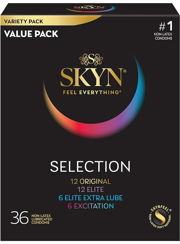 SKYN® Premium Polyisoprene Lubricated Condoms are made with our SKYNFEEL® material a non-latex material that feels soft and natural, and provides an extraordinary sensitivity. These condoms easily stretch and conform to your shape so that they are comfortable to use. They're free from natural rubber proteins, making them a suitable choice for people with a known or suspected latex allergy. * SKYN Selection Non-Latex Lubricated Condoms, 36 Count * Variety of sensations: SKYN Selection Variety pack features 3 types of assorted lubricated non-latex condoms including 10 Original, 6 Extra Studded and 8 Extra Lube condoms. * SKYNFEEL material: All SKYN condoms are made with SKYNFEEL material, a technologically advanced non-latex material that is barely noticeable but really strong. * Lubricated with long-lasting ultra-smooth lubricant.