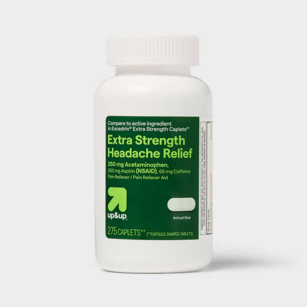 Go through your day with relief from headaches and other pains with the help of the Acetaminophen and Aspirin Added-Strength Pain Reliever Caplets from up & up™. With a combination of acetaminophen, aspirin and caffeine, you'll find quick relief from throbbing headaches or migraines. With each pain relief caplet, you can relieve the pain caused by muscle aches and menstrual cramps as well headache pain. The added caffeine helps to relax muscle contractions and improve mental altertness as you head off to work or spend time with loved ones. <br /><br /><br />We believe making smart choices for the people, places, and pets in your life should be easy and affordable. And, having quality you can trust should be a given. That’s why you can count on our promise – caring for your everyday in every way.<br /><br />Satisfaction guaranteed – Love it or your money back.
