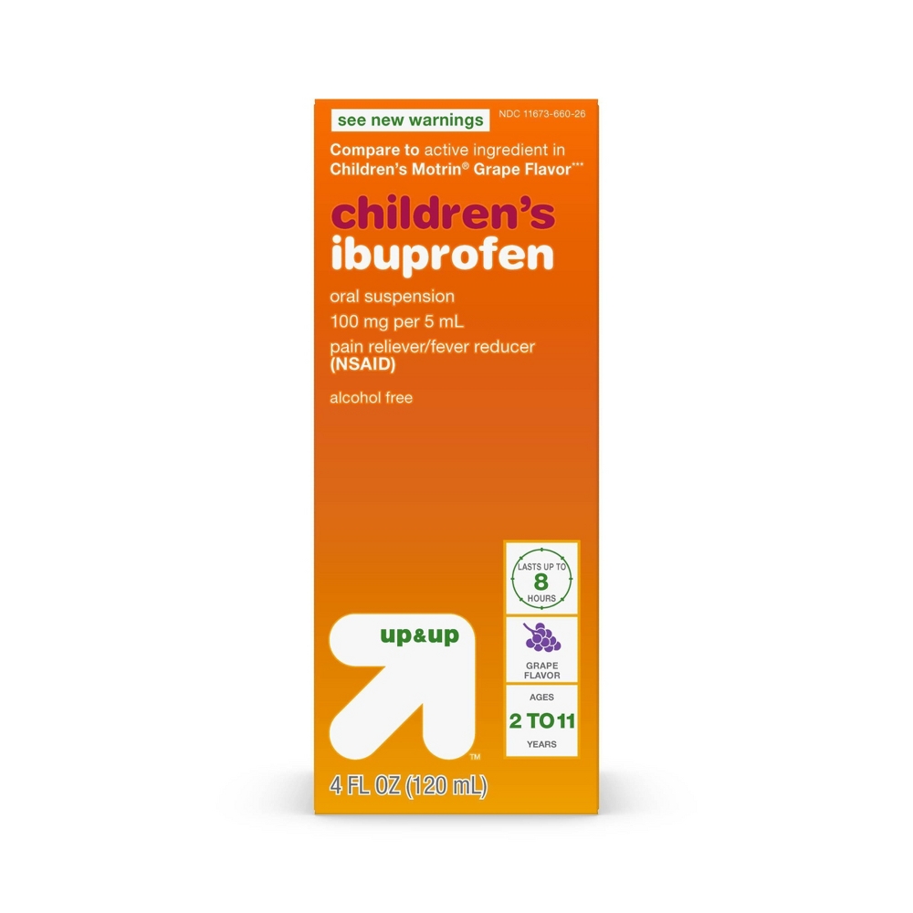 Compare to the active ingredient in Children’s Motrin Grape Flavor. Help your kids feel better with Up&Up Children's Ibuprofen Oral Suspension, Grape Flavor. This children’s cold medicine provides 8 hours of relief from minor aches and pains due to the common cold, flu, sore throat, headache and toothache. A nonsteroidal anti-inflammatory drug (NSAID) for children ages 2 to 11 years. This product is gluten free and contains no alcohol. Made for children. Features a child-resistant safety cap. Dosage cup included.