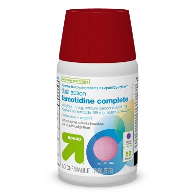 Compare to Pepcid Complete active ingredients. Up&Up Dual Action Complete Chewable Tablets, Berry Flavor, for fast heartburn relief. Three active ingredients in one tablet to control stomach acid production and neutralize stomach acid. Contains active ingredients famotidine 10 mg, acid reducer; calcium carbonate 800 mg, antacid; and magnesium hydroxide 165 mg, antacid. These dual action partners work to both control acid and relieve heartburn for adults and children 12 years and over. Chewable berry flavor tablet does not require water to use. Here is a fast heartburn relief medicine that you can bring anywhere.