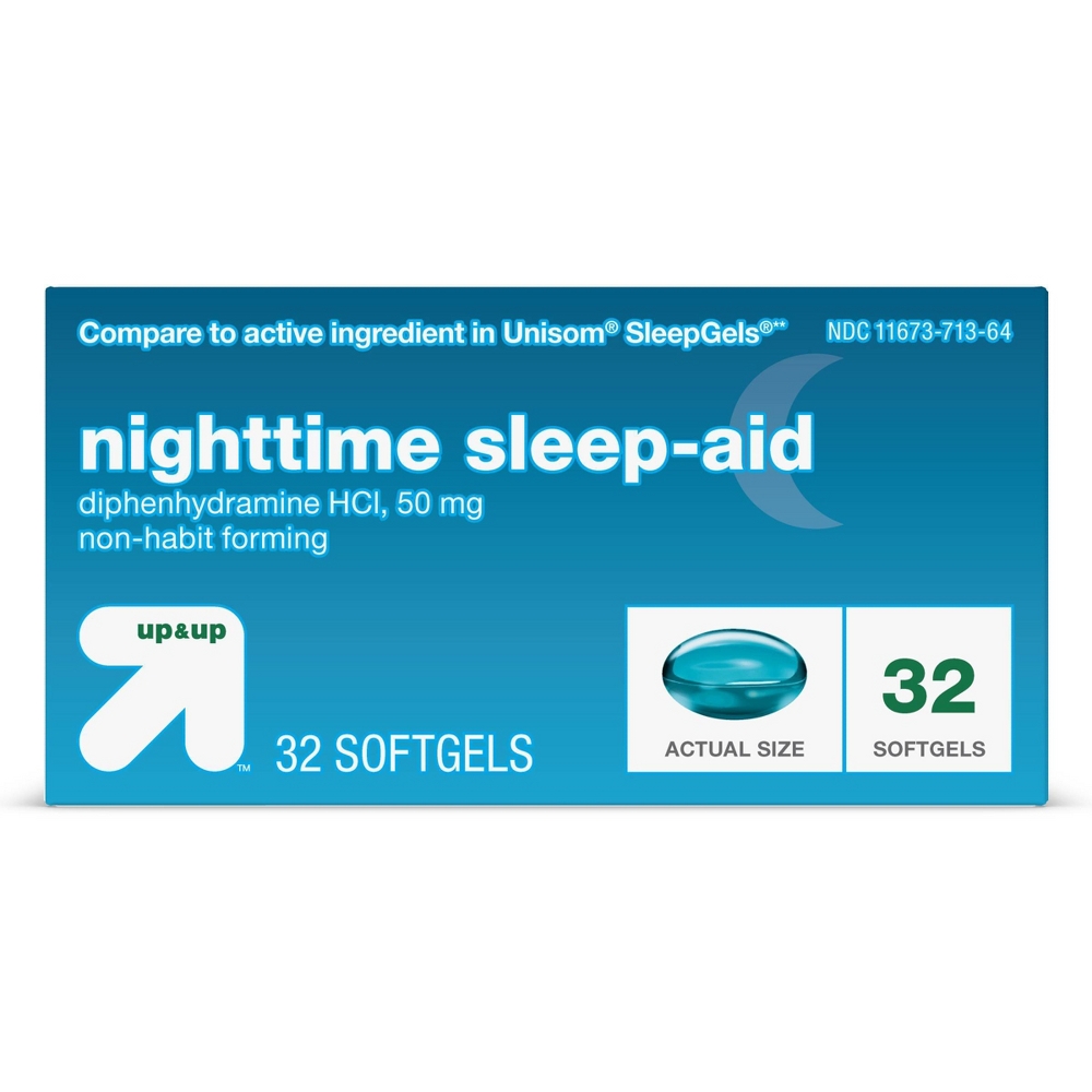 Compare to the active ingredient of Unisomae SleepGelsae. Use Nighttime Sleep Aid for when you have difficulty falling asleep. Nighttime Sleep Aid softgels contain the active ingredient diphenhydramine hydrochloride 50 mg. Non-habit forming. Made in Canada. If you’re not satisfied with any Target Owned Brand item, return it within one year with a receipt for an exchange or a refund.<br /><br /><br />We believe making smart choices for the people, places, and pets in your life should be easy and affordable. And, having quality you can trust should be a given. That’s why you can count on our promise – caring for your everyday in every way.<br /><br />Satisfaction guaranteed – Love it or your money back.