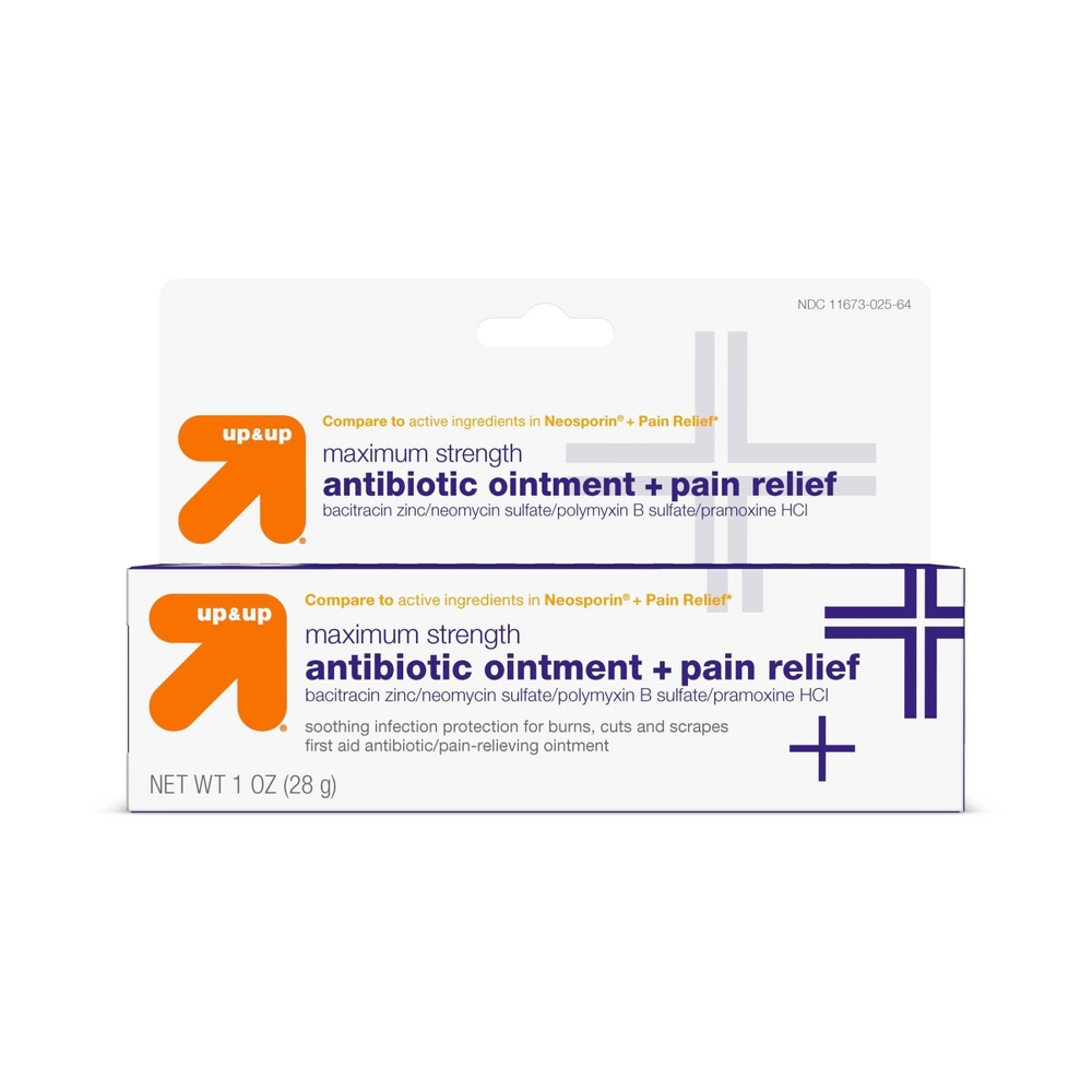 Compare to the active ingredients in Neosporinae. Maximum Strength First Aid Triple Antibiotic Pain Relieving Ointment is a must for any first aid kit. This maximum strength antibiotic ointment helps soothe and reduces pain in minor cuts, scrapes and burns while providing long lasting, 24 hour protection against infection. If you’re not satisfied with any Target Owned Brand item, return it within one year with a receipt for an exchange or a refund.