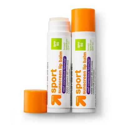 The SPF 50 Sport Sunscreen Lip Balm Twin-Pack from up & up™ gives your lips the outdoor protection they deserve. This twin-pack of sunscreen lip balm features a formula that glides smoothly for easy application, helping you keep your lips covered during warm-weather activities, and the water-resistant lip balm works for up to 80 minutes, offering plenty of versatile coverage. The balm provides broad spectrum SPF 50 protection from UVA/UVB rays, giving you the ability to stay comfortable for beach volleyball, dips in the pool and more — simply toss one in your bag before you leave the house for on-the-go convenience.