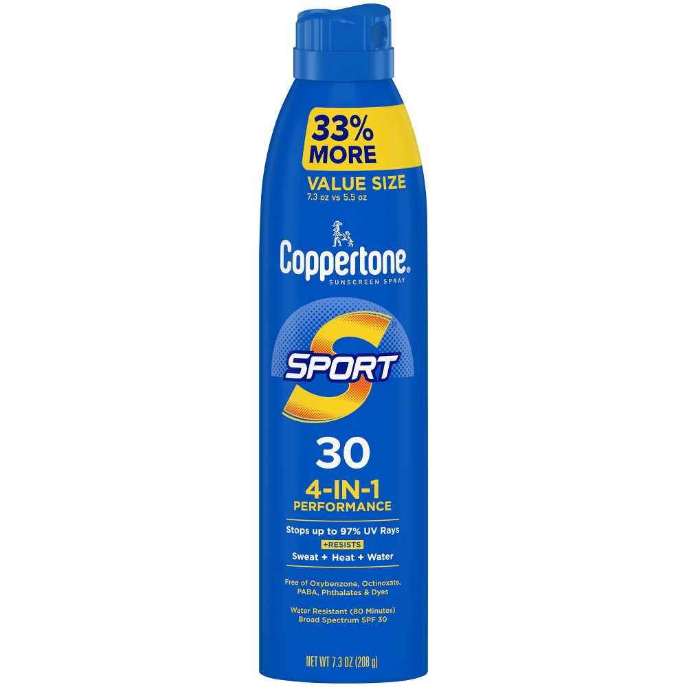 Coppertone Sport Continuous SPF 30 Sunscreen Spray is designed to stay on strong when you sweat. This high-performance spray sunscreen SPF 30 protects you from the sun with a durable and water resistant sunscreen formula (80 minutes). This Coppertone spray sunscreen offers Broad Spectrum UVA/UVB protection in a moisturizing formula, and has a continuous sprayer for application on any angle. Coppertone is voted the most trusted sunscreen brand*, and each sunscreen Coppertone creates follows a tradition of trusted, quality sun protection products. Depend on this tough sport sunscreen spray during any outdoor activities, whether you’re heading to the big game or enjoying an afternoon of fun in the sun. Use and reapply Coppertone sunscreen spray as directed.<br>*Voted most trusted sunscreen brand by American shoppers based on the 2022 BrandSpark American trust study.