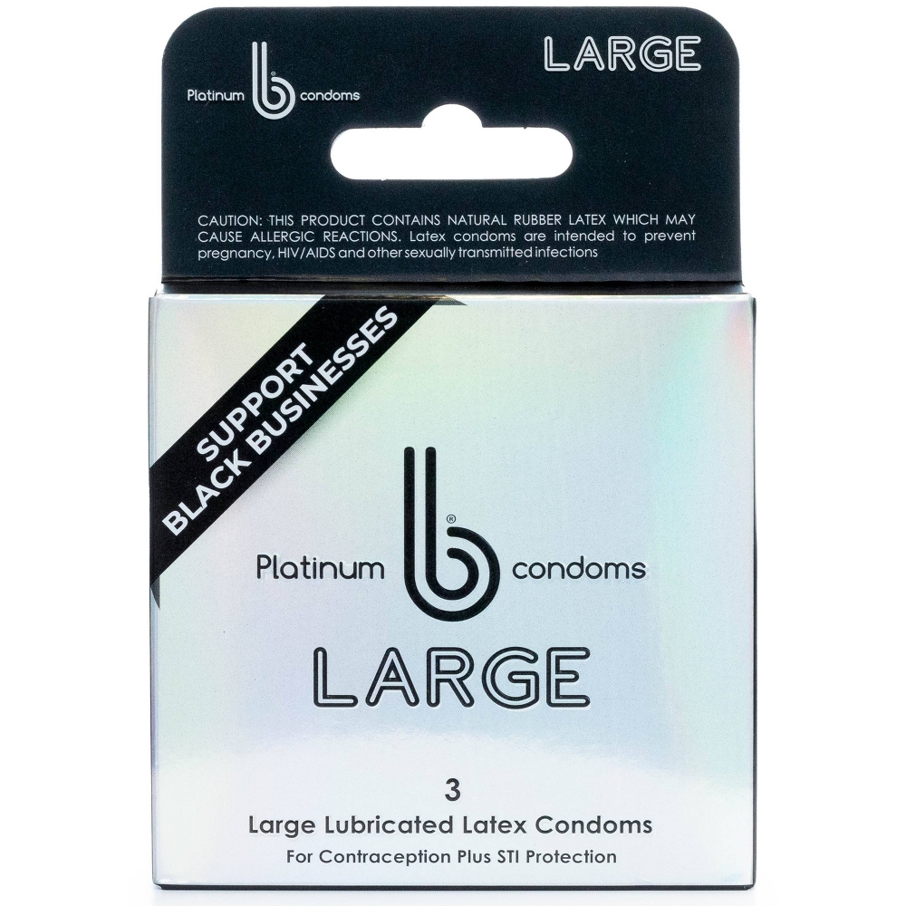 Introducing our Platinum Large b condoms. Platinum Large size b condoms (56mm) are not meant for people seeking traditional sized products and made with ultra-smooth, odor free, tasteless and pH friendly rubber latex and lubricant, they are silky smooth and designed to keep you safe, without stealing the show. You will experience a more sensitive and natural feel.<br /><br />b condoms is a black owned and operated condom company that works to decrease sexually transmitted infections, including HIV/AIDS, unplanned pregnancy and human trafficking in communities of color. We have nearly a decade of experience supplying sexual wellness and family planning products while promoting safe sex and healthy lifestyles. Our services include consumer packaged goods and health equity for communities of color.