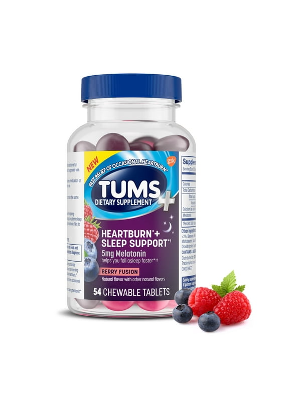 TUMS Heartburn Plus Sleep Support Dietary Supplement Chewable Tablets offer fast relief of occasional heartburn and includes 5mg of melatonin to help you fall asleep faster (1,2,3). For occasional sleeplessness, chew and swallow two tablets at bedtime (2,3). Including melatonin 5mg in a two tablet serving, these Heartburn and Sleep Support Tablets relieve occasional heartburn plus help you fall asleep faster (1,2,3). Each serving delivers fast relief of occasional heartburn and comes in a berry fusion flavor (1,3). TUMS Heartburn Plus Sleep Support Chewable Tablets are packaged in a compact, resealable bottle that’s easy to stow. Choose TUMS Heartburn Plus Sleep Support at home. (1) 600 mg of elemental calcium per serving (2 chews) is equivalent to 1500 mg calcium carbonate (2) Sleep support: Includes 5mg of Melatonin to provide relief from occasional sleeplessness when you have heartburn. Helps you fall asleep faster: Compared to those not taking melatonin (3). (3) These statements have not been evaluated by the Food and Drug Administration. This product is not intended to diagnose, treat, cure or prevent any disease.