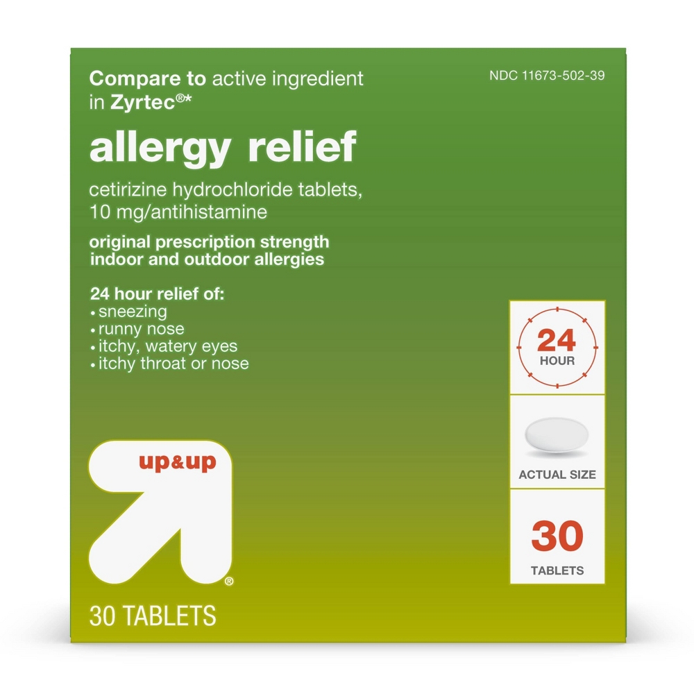 Take on both indoor and outdoor allergies with the help of Cetirizine Hydrochloride Allergy Relief Tablets from up & up™. Compared to the active ingredient in Zyrtec, these tablets develop the same relief at a fraction of the price. You'll get 24-hour relief from allergy symptoms such as sneezing, runny nose, itchy, watery eyes and itchy throat or nose. <br /><br />We believe making smart choices for the people, places, and pets in your life should be easy and affordable. And, having quality you can trust should be a given. That’s why you can count on our promise – caring for your everyday in every way.<br /><br />Satisfaction guaranteed – Love it or your money back.