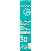Aveeno Protect + Soothe Face Mineral Sunscreen SPF 30 provides daily sun protection with a light, silky feel. Formulated with soothing oat, this face sunscreen from a dermatologist-recommended brand for over 70 years has a refreshing, lightweight, and non-greasy formula that rubs in effortlessly. It delivers SPF 30 protection from harmful UVA and UVB rays to help prevent sunburn and signs of premature aging. When used as directed and combined with other sun protection measures, the sunscreen also decreases the risk of skin cancer caused by the sun. Specially formulated for sensitive skin and ideal for outdoor use, the facial sunscreen has 100% mineral active ingredients, is water-resistant for 80 minutes, and is fragrance-free, paraben-free, phthalate-free, oxybenzone-free, and dye-free. Aveeno Protect + Soothe Face Mineral Sunscreen SPF 30 comes in a TSA-compliant tube that's perfect for travel. * Aveeno Protect + Soothe Mineral Face Sunscreen with Broad Spectrum SPF 30 for daily sun protection * Face sunscreen for sensitive skin provides daily sun protection with a light, silky feel * SPF 30 protects from harmful UVA & UVB rays to help prevent sunburn and signs of premature aging * Mineral sunscreen has a lightweight and non-greasy formula that rubs in effortlessly * Formulated with soothing oat and 100% mineral active ingredients that's naturally sourced * Use as directed with other protection measures to decrease risk of skin cancer caused by the sun * Sunscreen is water-resistant for 80 minutes, so it's ideal for outdoor sports & activities * Face sunscreen for sensitive skin is fragrance-, paraben-, phthalate-, oxybenzone-, and dye-free