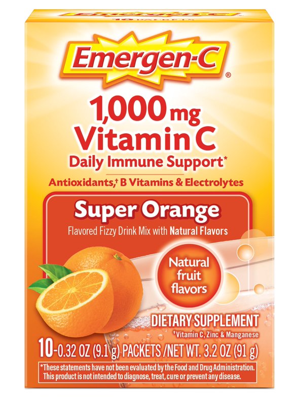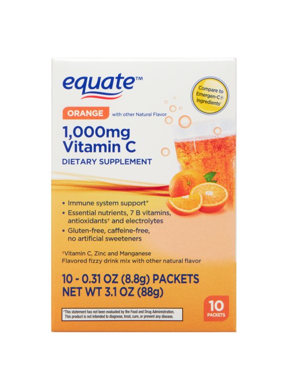 Introducing Equate 1000 mg Vitamin C Powder Supplement Drink Mix—an all-inclusive blend of essential nutrients for both men and women (unisex). This unique formula not only refreshes and nourishes but also provides comprehensive immune system support, antioxidant defense, and metabolism support. The delightful orange flavor adds a zesty touch of oranges to your daily routine. Additionally, this versatile powder can be used as a post-workout drink, replenishing key electrolytes lost through sweating and restoring calcium, magnesium, sodium, and potassium levels. Each convenient packet is enriched with Vitamins C, B6, B12, and zinc, contributing to the maintenance and support of a robust immune system. Simply mix one packet with 4-6 oz of water to enjoy a refreshing and nutrient-packed beverage. Elevate your well-being with Equate's advanced Vitamin C Powder Supplement Drink Mix—your go-to solution for a balanced and revitalizing daily boost. This formula contains a powerhouse of vitamins and minerals, including Thiamine, Riboflavin, Niacin, Vitamin B6, Folate, Vitamin B12, Pantothenic Acid, Calcium, Phosphorus, Magnesium, Zinc, Manganese, Chromium, Sodium, Potassium, along with the goodness of Fructose, Citric Acid, and more. With less than 2% of Maltodextrin, Malic Acid, Dried Orange Juice Concentrate, Acacia, Sugar, Natural Flavors, Corn Syrup Solids, Silicon Dioxide, Modified Food Starch, Beta-Carotene (color), Glycine, Aspartic Acid, Tartaric Acid, Water, and Tocopherol. * Great Orange flavored taste * Combination of essential nutrients * Provides immune system support, antioxidant defense support, and metabolism support * Easy to mix, just mix with water * Each packet also includes Vitamins C, B6, B12, and the mineral zinc * 30 Packets in each box